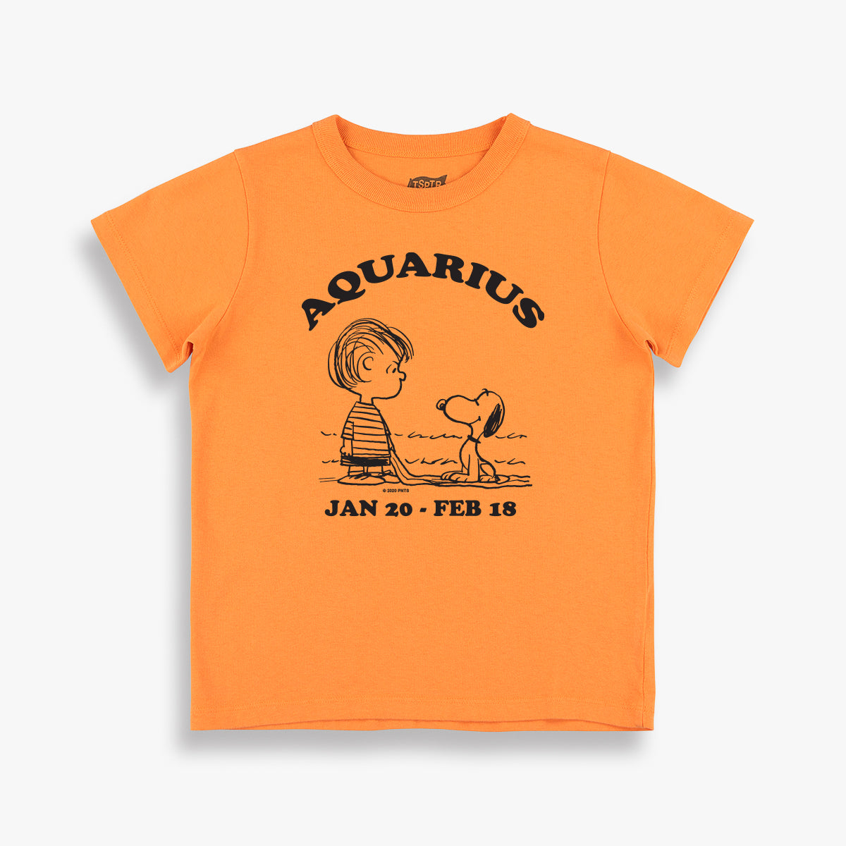 Orange premium weight 100% cotton kids tee with an authentic early 70s Peanuts Star Sign print from the Determined Production catalog.