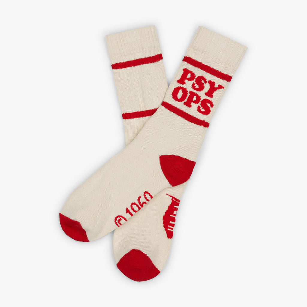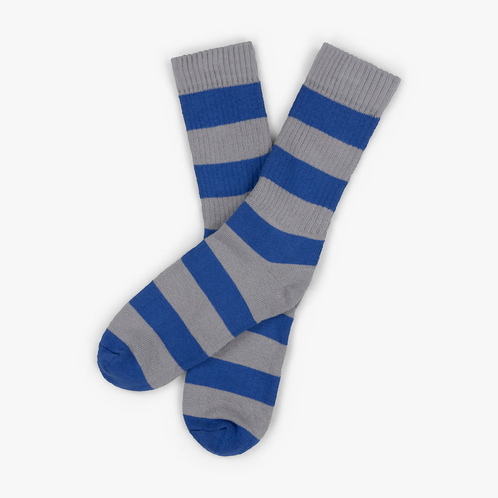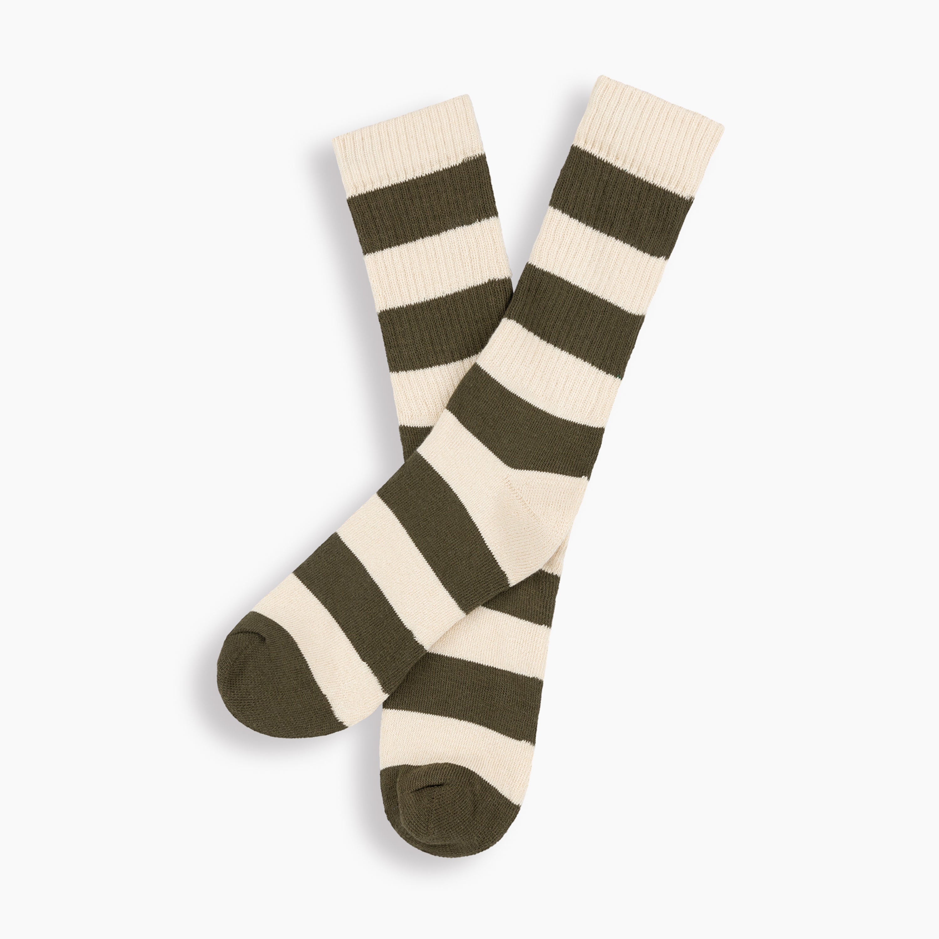 Classic 1960s style knitted stripe Border socks in Olive and Ecru.